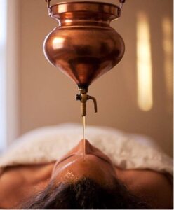 Pouring medicated warm herbal oil over the forehead throughout the treatment