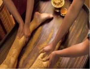 Massage with herbal powder preceded by an oil therapy. This massage involves upward stroking of the herbal powder