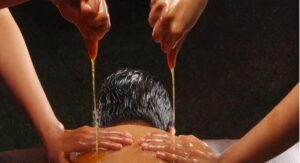 Continuous pouring of lukewarm medicated oil in the form of a stream followed by a rejuvenating massage